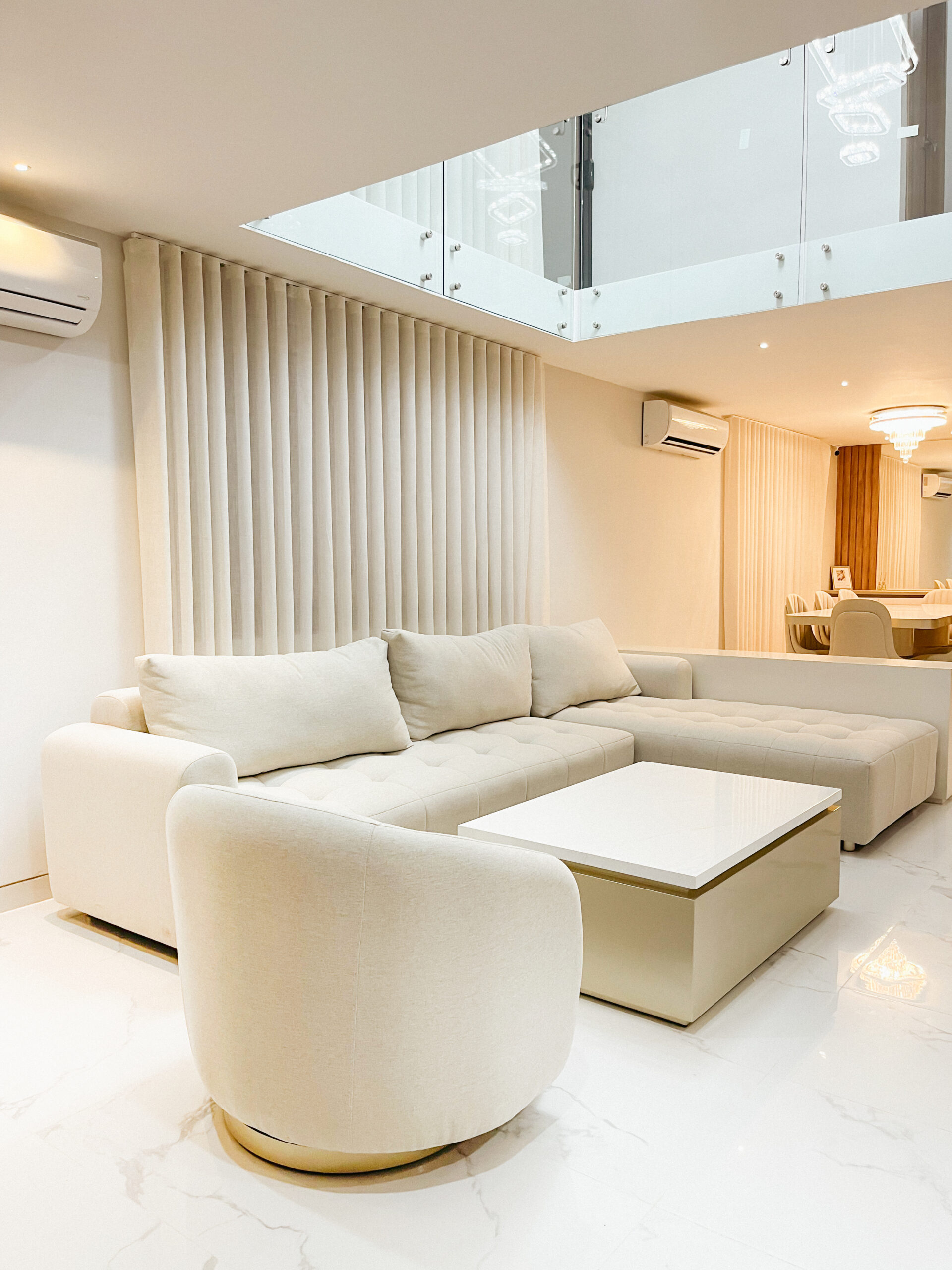 Este ambiente fusiona líneas limpias, tonos crema y superficies brillantes para lograr una estética moderna, luminosa y sofisticada. El mobiliario en tonos neutros, el mármol sutil del piso y los detalles arquitectónicos como el corte en el techo y el vidrio superior amplifican la sensación de amplitud. Cada elemento —desde el sofá en L hasta el espejo del comedor— está pensado para reflejar elegancia sin excesos. Es diseño que ordena, relaja y eleva.